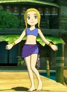 Esther has blonde ponytail and blue eyes. She wears a dark indigo crop top with a gold neck collar and light purple short sleeves, a matching dark indigo skirt with a gold band near the bottom, and pink puffy pants with gold bands at the legs and orange dancers' slippers. At the Winter Isles, she wears a pink coat with fluffy white edges. In Castaway Cove she wears a blue bikini with a purple wrap skirt around her waist.